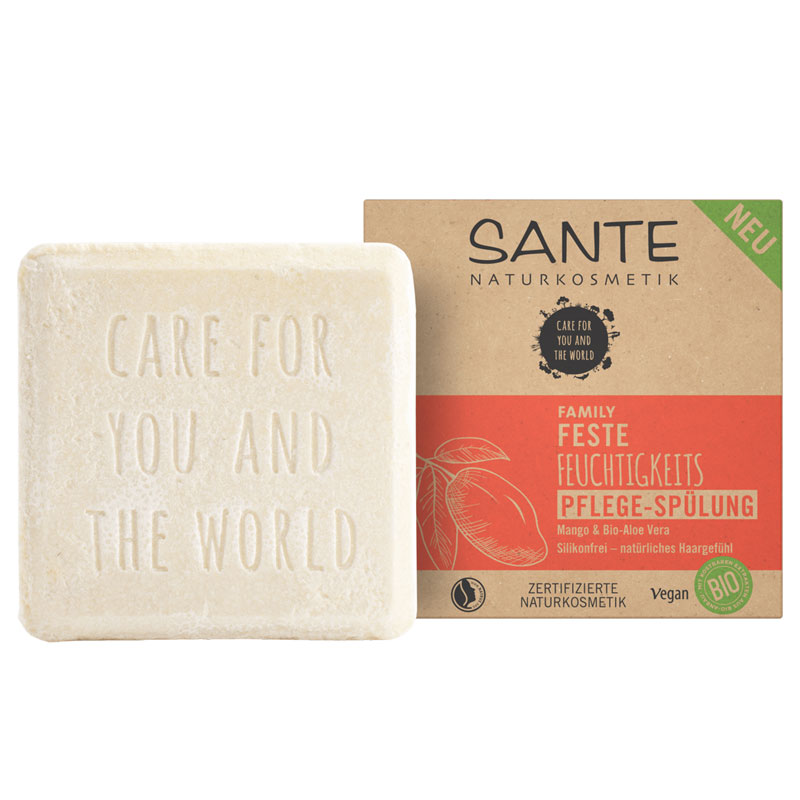 Die Sante Feste Feuchtigkeits-Pflege-Spülung verbindet Haarpflege mit einem konsequent nachhaltigen Konzept. Die feste Spülung wurde für trockenes Haar entwickelt und unterstützt die Pflege der Längen, ohne zu beschweren – ganz ohne Silikone und ohne Plastikverpackung.