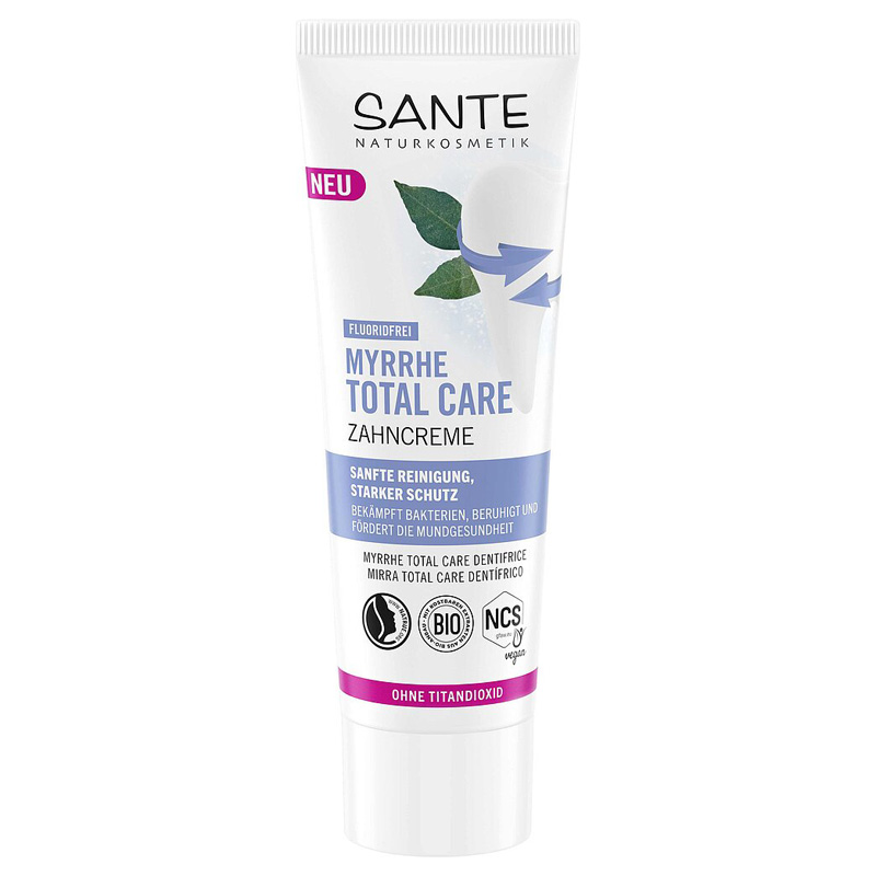 Die Sante TOTAL CARE Zahncreme Myrrhe wurde für eine sanfte und zugleich gründliche Zahnpflege entwickelt. Die natriumfluoridfreie Rezeptur ist ohne Titandioxid und eignet sich bei homöopathischer Behandlung sowie bei bereits ausreichender Fluoridversorgung.